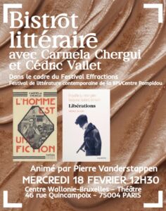 Cédric Vallet sera présent au Festival Effractions à Paris pour le lancement de Libérations avec Carmela Chergui. La rencontre sera animée par Pierre Vanderstappen. Le Festival Effractions mets à l’honneur le réel lorsqu’il fait effraction dans la littérature.
